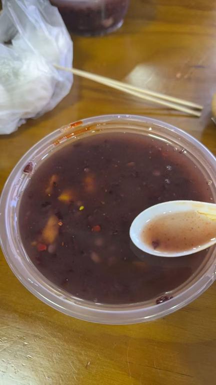 不过第二天早上5点来钟醒来后在某个服务区买了早饭,一碗紫米粥5元,加些糖和咸菜。既加糖又加咸菜真的会很好吃,推荐大家一试。显然被我推荐的其他人都领略不到美味之处,很遗憾:
